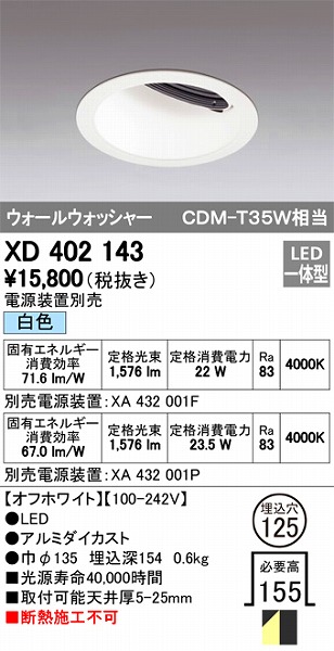 XD402143 オーデリック ウォールウォッシャーダウンライト LED(白色)