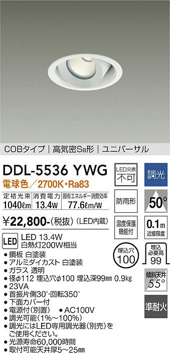| メーカー / 型番 | DAIKO DDL-5536YWG ユニバーサルダウンライト(軒下用兼用) |
