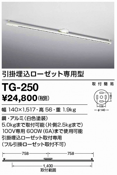 | メーカー / 型番 | 山田照明 TG-250 簡易取付型レール |