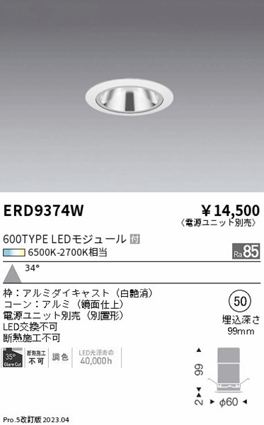 | メーカー / 型番 | 遠藤照明 ERD9374W グレアレスベースダウンライト |