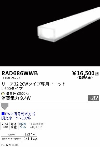 RAD686WWB 遠藤照明 LEDユニット リニア32 L600 ホワイト 温白色 PWM調光 拡散