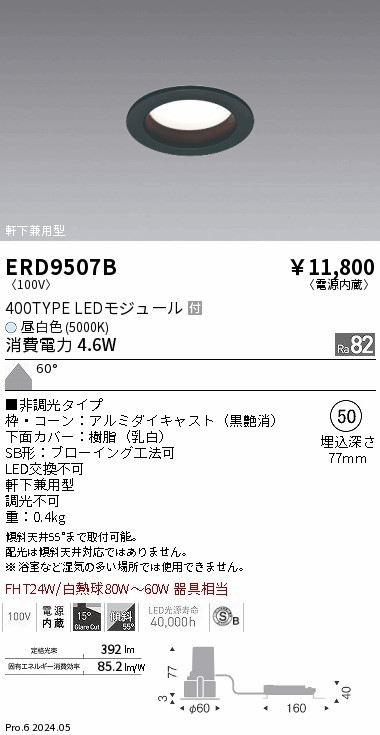 | メーカー / 型番 | 遠藤照明 ERD9507B ダウンライト |
