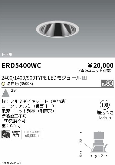 | メーカー / 型番 | 遠藤照明 ERD5400WC 軒下用グレアレスダウンライト |