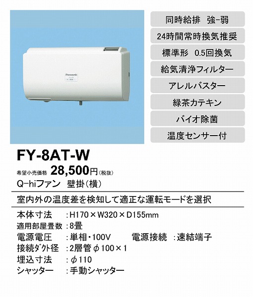 | メーカー / 型番 | パナソニック FY-8AT-W Q-hiファン 自動運転形 |