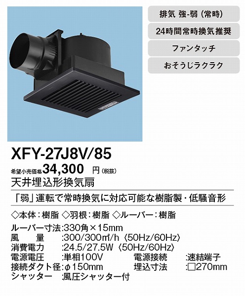 | メーカー / 型番 | パナソニック XFY-27J8V/85 天井埋込形換気扇 常時換気付 |