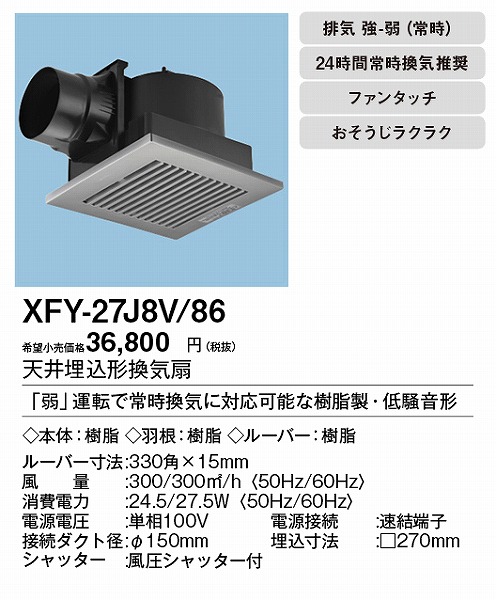 | メーカー / 型番 | パナソニック XFY-27J8V/86 天井埋込形換気扇 常時換気付 |