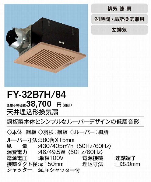 メーカー / 型番 パナソニック XFY-32B7H/84 天井埋込形換気扇 低騒音・大風量形 ライトブラウン・薄型
