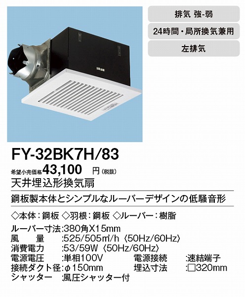 | メーカー / 型番 | パナソニック XFY-32BK7H/83 天井埋込形換気扇 低騒音・特大風量形 ホワイト・薄型 |