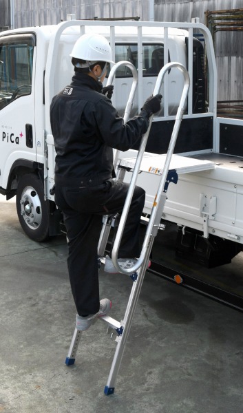 | 商品について | トラックのあおり部分に取り付けて、荷台への昇降をサポートします。 最大使用質量:150kg 天場寸法:400×427mm 踏ざん間隔:317mm 設置寸法:昇降面435mm、長さ723〜855mm ・フック内幅寸法63mm ■特長 ・折りたたみ式でコンパクトに収納できます。 ・回転スライド収納式手すり標準装備。手すりロックは指1本で操作でき、手すりを裏表どちらでも設置可能。 ・脚の長さは25mmピッチで調整できます(最大約43cm) ※法人限定商品、お届け先住所に必ず法人名を明記ください。 |