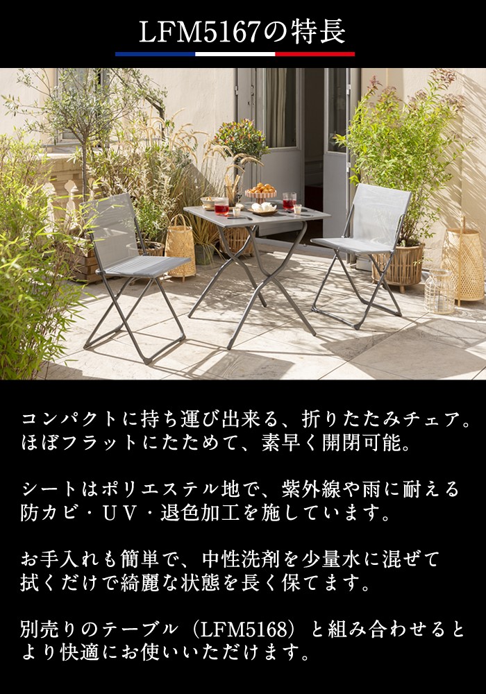 | 商品について | 使用時:W91×D83×H87cm、収納時:W12×D12×H116cm フレーム:スチール、シート:高密度ポリエステル 耐荷重:約110kg 背幅も広く、ゆったりとハンモックのような座り心地が特徴で、インテリアはもちろん、テラスやベランダ、キャンプシーンなど場所を選ばず使用することができます。 折りたたみも簡単なので、使用しないときはすっきりとコンパクトに収納することが可能です。 ※別売りの「VOGUE」(三角テーブル)でより快適で充実した時間をお過ごしください。 フランス企業が開発した「Airlon+」は、ポリエステル100%で先染め加工を行った鮮やかな色彩が魅力の生地になっています。 こちらの生地は繰り返しお洗濯ができるので、衛生的にも安心してお使いいただけます。 足元部はラフマ「特許技術」であるゴム製のジョイントを採用。 耐久性とクッション性を兼ね備え、身体全体をしっかりと支えてくれます。 Lafumaこだわりの金属フレームは「スチール素材」を採用。 適度に反発性のあるフレームなので体重の圧力を分散させ、チェア全体で身体を包み込む構造になっています。 こちらのフレームは屋外の過酷な環境にも耐えられる様に、車の塗装にも使われる「板金塗装」を採用しているので、屋外でも錆びにくく、機能性の高い作りになっています。 ※フレームはLafuma独自の5年保証。 |