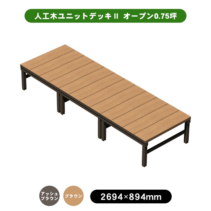 | 商品仕様 | カラー/サイズ区分: アッシュブラウン 0.75坪 本体サイズ: D894×W2694×H450-550mm・重59kg 主な仕様: 人工木ユニットデッキII オープンタイプ 0.75坪 アッシュブラウン 20230721 |