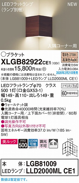 | 商品仕様 | カラー区分: ウォールナット ランプ色: LED(電球色) 合計W数: 5 ランプ・W数: LEDフラットランプφ70 クラス500 1灯(口金GX53-1) 取付方法: 入隅コーナー用 本体サイズ: 幅149・高110・出しろ149 主な仕様: 白熱電球60形1灯器具相当 美ルック 20200304 |