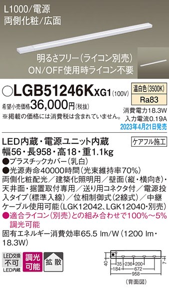 LGB51246KXG1 パナソニック 間接照明 スリムライン照明 電源投入タイプ(標準入線) 両側化粧 L1000 LED 温白色 調光 拡散