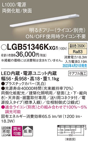 LGB51346KXG1 パナソニック 間接照明 スリムライン照明 電源投入タイプ(標準入線) 両側化粧 L1000 LED 温白色 調光 拡散