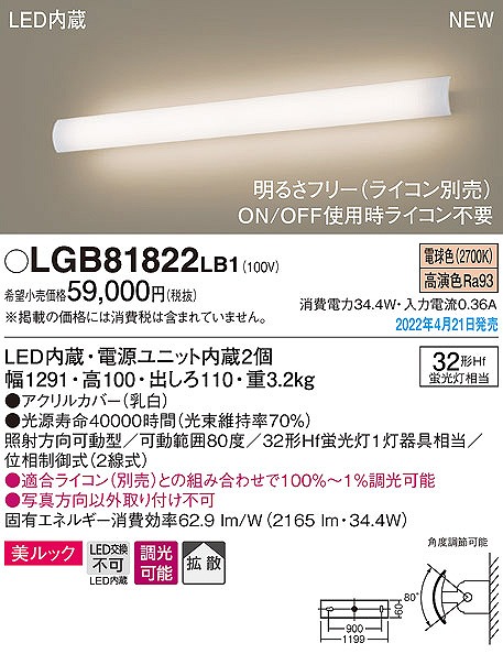 LGB81822LB1 パナソニック ユニバーサルブラケット LED 電球色 調光 拡散