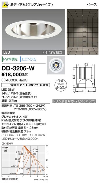 | 商品について | 美しい光を追求したダウンライト。まるで白熱普通ランプのような、柔らかい光。LED光源には多重影や光の粒が目立つなど、さまざまな問題があります。「ユニコーン プラス」はドーム状の拡散レンズによって、高い透過率を維持しながら適度に拡散し、柔らかな光と影を生み出します。カットオフアングルに配慮したグレアレスコーン仕様も用意しています。白熱光源のようなシリコンカバーを用い一粒のLEDで美しい光を表現しました。素材の明暗を際立たせるハイグレードな演出に最適です。光の陰影を際立たせるデザイン。コンパクト蛍光灯と同サイズのためLEDへの移行も違和感なく行えます。 電源別売:TG-386(100〜242V)/TG-389(100V/200V) 電源別置型 PWM調光対応(TG-386接続時) LUTRON 次世代照明制御プロトコル EcoSystem 対応(TG-389接続時) グレアカットオフ:40° 取付可能天井厚5〜25mm 被照射物近接限度0.3m 4000K Ra83 ミディアム26° FHT42W相当 天井切込穴寸法φ125mm ※LED素子にはバラツキがあるため同一形名の器具においても光色、明るさが異なる場合があります。 |