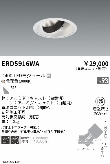 ERD5916WA 遠藤照明 ユニバーサルダウンライト φ125 ホワイト LED(電球色) 広角 (ERD5916WA)