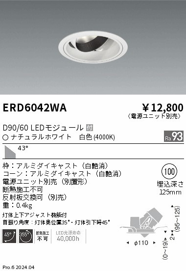 | メーカー / 型番 | 遠藤照明 ERD6042WA ユニバーサルダウンライト |