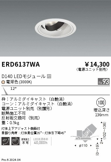 ERD6137WA 遠藤照明 ユニバーサルダウンライト φ100 ホワイト LED(電球色) 狭角 (ERD6137WA)