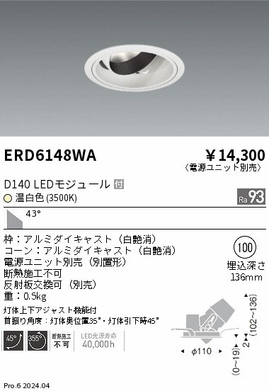 | メーカー / 型番 | 遠藤照明 ERD6148WA ユニバーサルダウンライト |