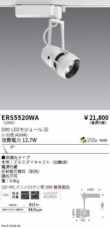 | メーカー / 型番 | 遠藤照明 ERS5520WA レール用スポットライト |