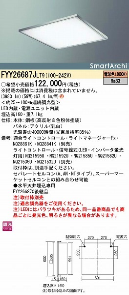 | メーカー / 型番 | パナソニック FYY26687JLT9 埋込スクエアベースライト パネル付 |