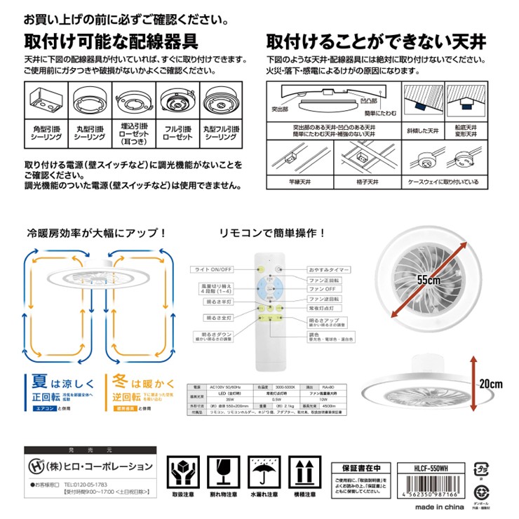 メーカー / 型番 | ヒロコーポレーション HLCF-550WH シーリングファンライト |