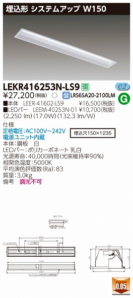 | メーカー / 型番 | 東芝ライテック LEKR416253N-LS9 埋込ベースライト |