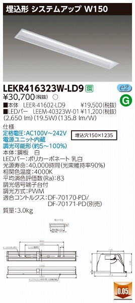 | メーカー / 型番 | 東芝ライテック LEKR416323W-LD9 埋込ベースライト |