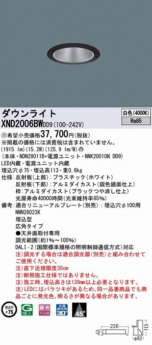 | メーカー / 型番 | パナソニック XND2006BWDD9 ダウンライト |