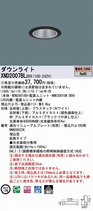 | メーカー / 型番 | パナソニック XND2007BLDD9 ダウンライト |