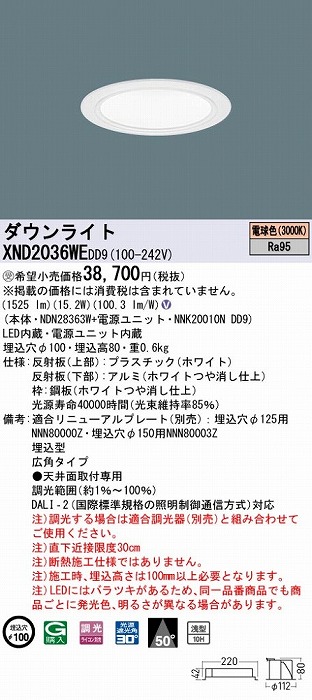 XND2036WEDD9 パナソニック ダウンライト ホワイト φ100 LED 電球色 調光 DALI-2対応 広角