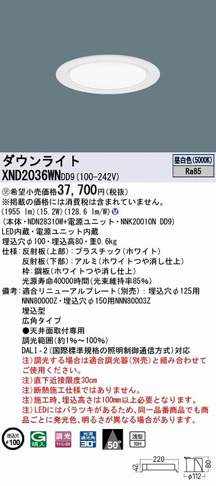 XND2036WNDD9 パナソニック ダウンライト ホワイト φ100 LED 昼白色 調光 DALI-2対応 広角