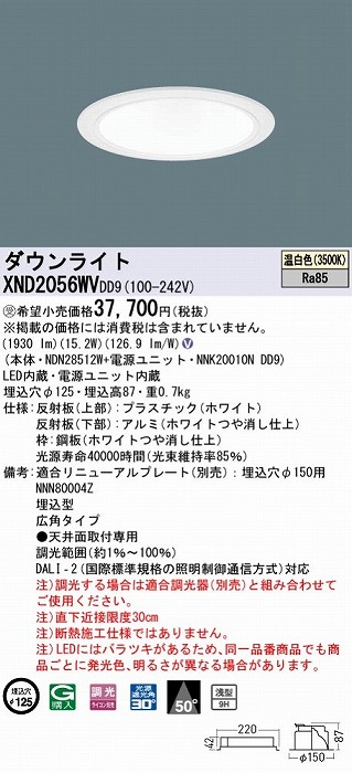 | メーカー / 型番 | パナソニック XND2056WVDD9 ダウンライト |