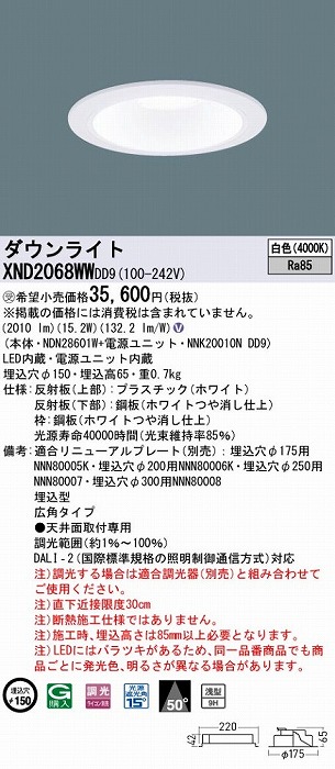 | メーカー / 型番 | パナソニック XND2068WWDD9 ダウンライト |