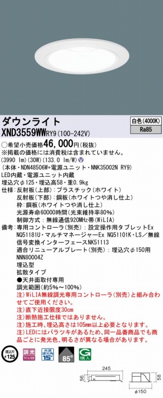 | メーカー / 型番 | パナソニック XND3559WWRY9 ダウンライト |