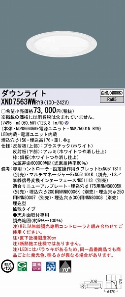 | メーカー / 型番 | パナソニック XND7563WWRY9 ダウンライト |