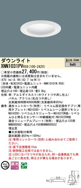 | メーカー / 型番 | パナソニック XNN1031PVRS9 ダウンライト |
