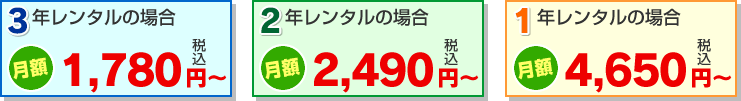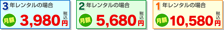 | ※ | 2年・3年レンタルの場合、期間中の<中途解約>に関しましては、解約料として残り期間のレンタル料金の80%をお支払いいただきます。 |
